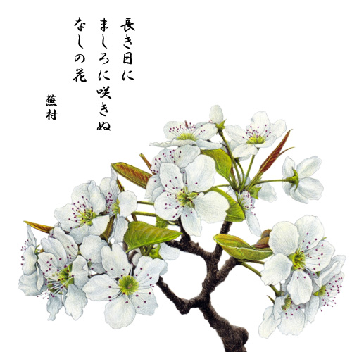 【梨の花】梨の楚々とした白色五弁の花は、実ほどではないにしろ昔から親しまれ、『江戸名所花暦』には梅や桜、椿、桃などと並び、梨畑で棚に造るなどとした「梨花」の記載もある。花期は短く、晩春、浅緑の新葉とともに出て、枝先に花付きもよく、棚の一面に咲き渡る。(2026年・歳時記カレンダーより)