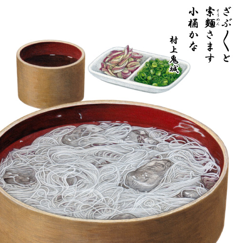 【冷索麵】茹でて冷水に洗った索麵は喉ごしよく、見た目にも涼しげで、夏場にはなんとも嬉しいもの。ちなみに、索麵で七夕を祝う風習は、古く節会に食された、菓子の〝索餅(さくべい)〟がもとともいうが、細く長い索麵を織姫の織り糸にもなぞらえたのか。(2026年・歳時記カレンダーより)